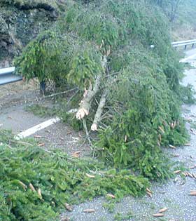 En hel hårv med mannfolk fikk til slutt løfta av dette treet, etter at jeg hadde fårr formaninger om at jeg bare måtte sitte i bilen, det blåste jo så fælt ute, så jeg skulle slippe å komme ut.